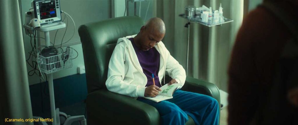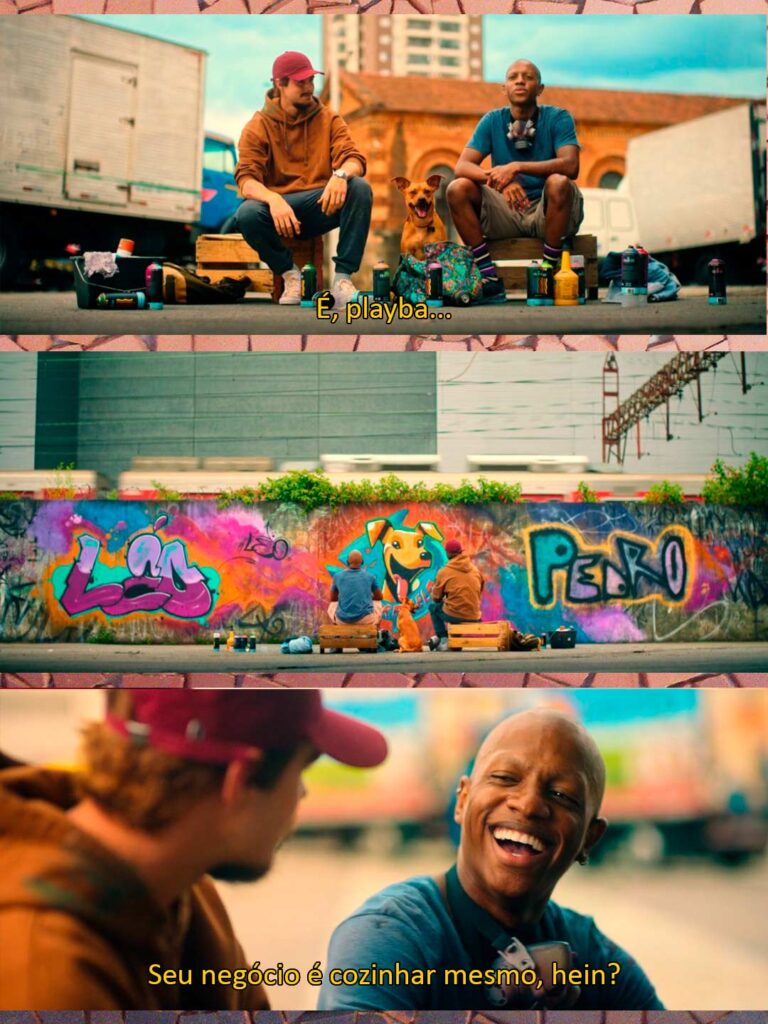 Nas primeiras páginas, ilustrei um Léo mais soturno, melancólico e pessimista. Porém, nas folhas seguintes temos ilustrações mais coloridas e estilizadas, como se ele fosse aprendendo a ser otimista ao longo dos dias de tratamento. Nos últimos 10 rascunhos, as cores ficam ainda mais intensas, quando Léo conhece Pedro e Caramelo. As letras com estética marginal foram feitas pelo Weslley “Lelo”. Dentre essas ilustrações, fiz a caricatura de Pedro (Rafa Vitti). A direção gostou tanto dessa caricatura a ponto de usá-la em duas cenas! 😍 Além de usar um outro desenho desse caderno para ilustrar uma carta escrita por Léo.