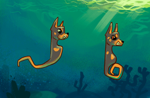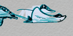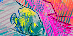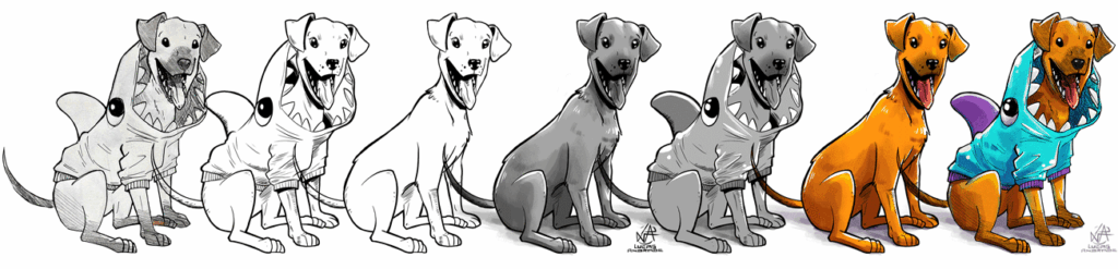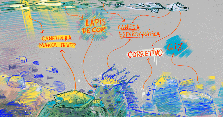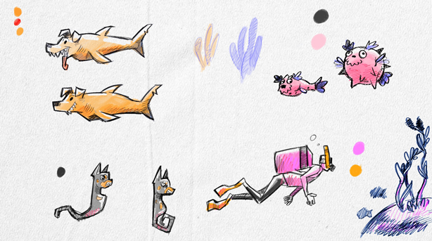 A ideia era fazer o Caramelo se transformar na sua grande paixão: tubarão! Usei dos meus conhecimentos que adquiri em minha graduação em Biologia para definir os elementos dos planos de fundo: 12 espécies de animais nativos da costa brasileira.