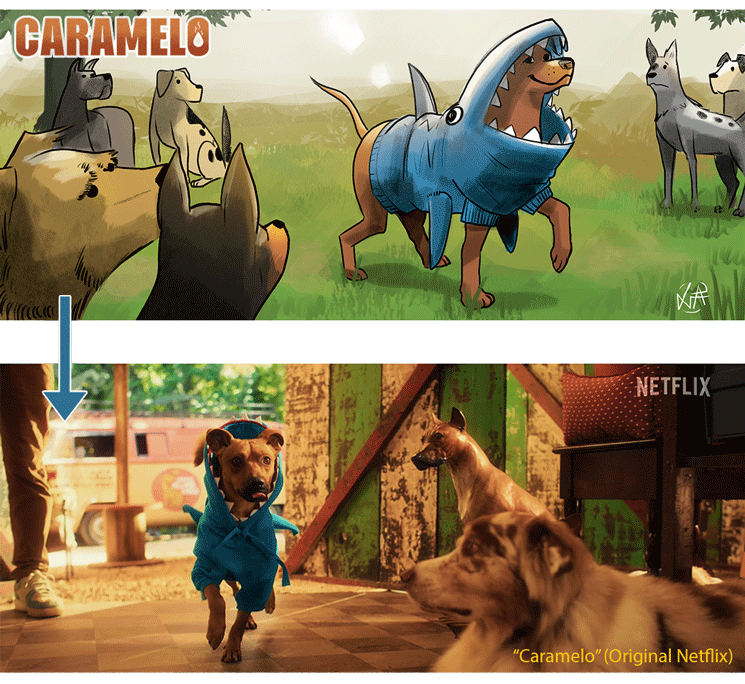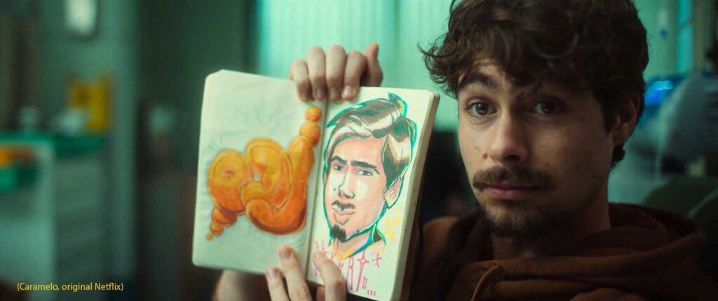 Ao longo de 2024 e 2025 fui convidado para fazer o storyboard de Caramelo, um filme original Netflix, que te leva às lágrimas e a boas gargalhadas. Mas, eu mal sabia que a equipe iria me chamar para produzir artes que apareceriam na tela, como flipbooks, caricaturas e murais ilustrados, além de artes para camiseta oficial da equipe e até a animação de créditos finais!