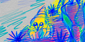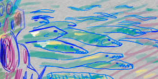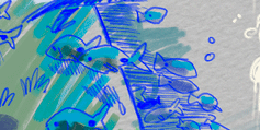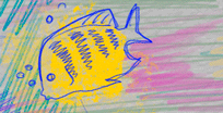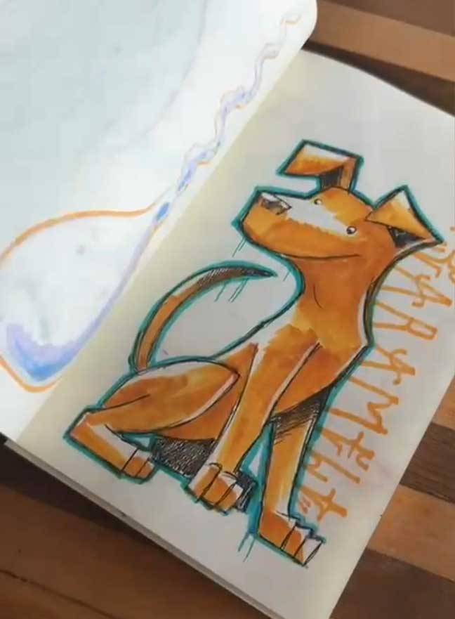 Para manter a identidade visual das artes feitas pelo personagem Léo, também fui escalado para criar artes no estilo graffiti. Na primeira ilustração tentei expressar o mesmo traço que fiz nos flipbooks. Fiz questão de colocar esse fundo de tubarão, inspirado no logo de Sonic Adventure 2.