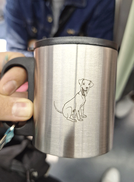 Como se não bastasse, a Michelle Acquesta, da Coordenação Executiva me procurou! Esse time estava preparando uma gravação sustentável, sem copos descartáveis. Por isso, ela bateu em minha sala perguntando se eu não tinha alguma arte sobrando para canecas e camisetas. Folheei meu sketchbook (tal como o Léo), onde fiz meus primeiros estudos para o storyboard, e lá estava a arte pronta do Caramelo vestido de tubarão!