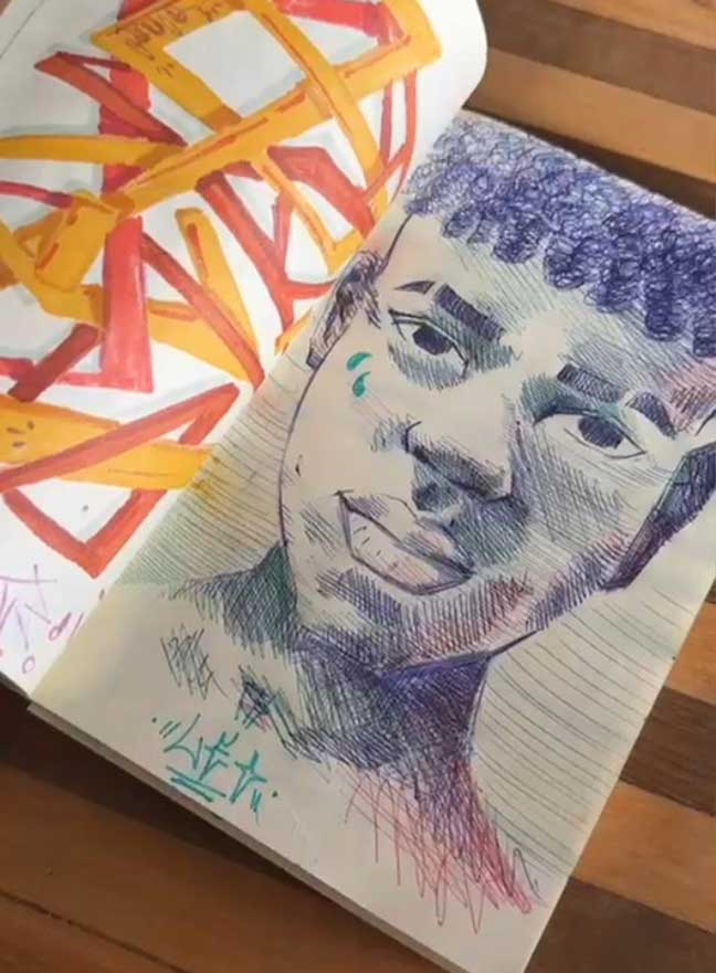 Dentro do caderno, por capricho e verossimilhança, eu resolvi fazer um extra: desenhei 30 desenhos variados. Nele, me aprofundei sobre qual seria a história de Léo, estabeleci as fases de sua vida e que tipo de desenho ele faria. Imaginei Léo desenhando nas calçadas, ônibus e quebradas.