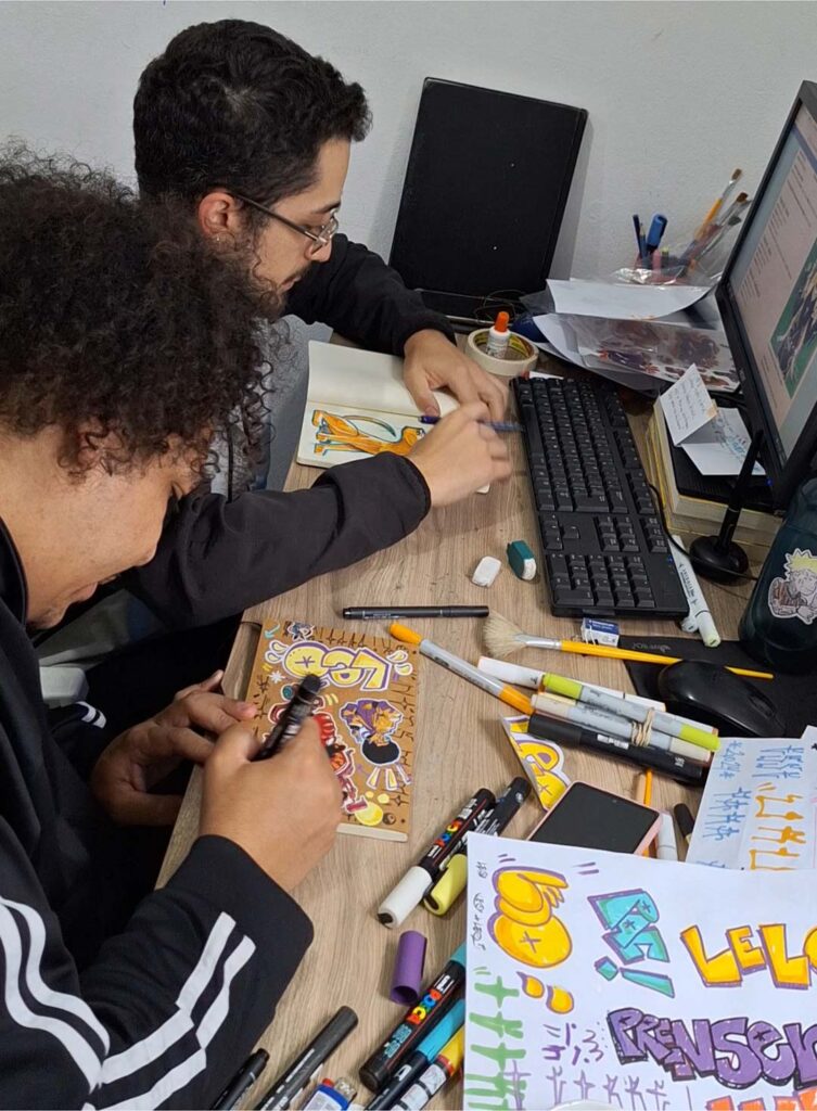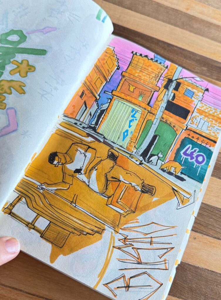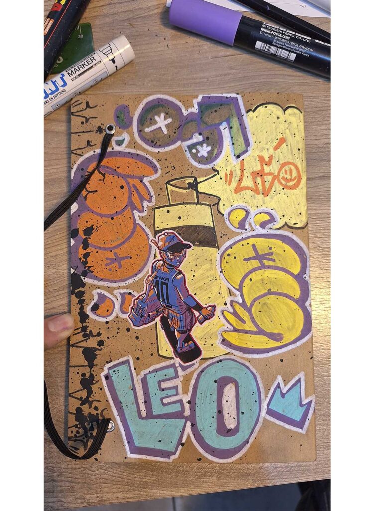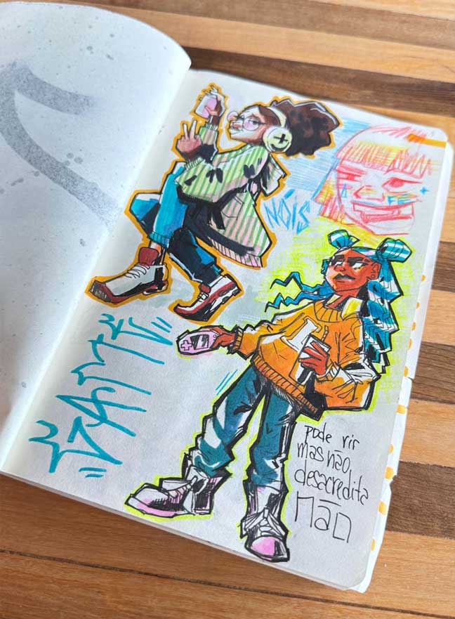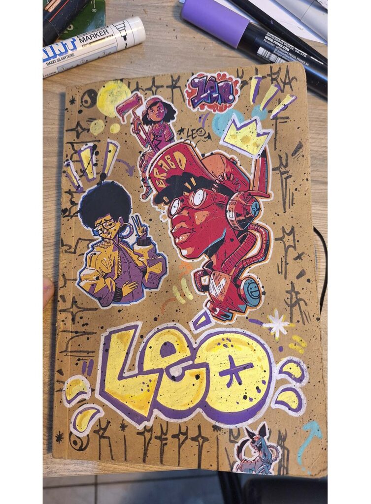 Minha principal referência foi meu próprio sketchbook. Surrado, com adesivos e escritas personalizadas. Como Léo é grafiteiro, chamei Weslley “Lelo” Silva, grafiteiro da zona sul de São Paulo, para me ajudar nessa missão. Também confeccionei adesivos exclusivos para colar na capa do caderno.