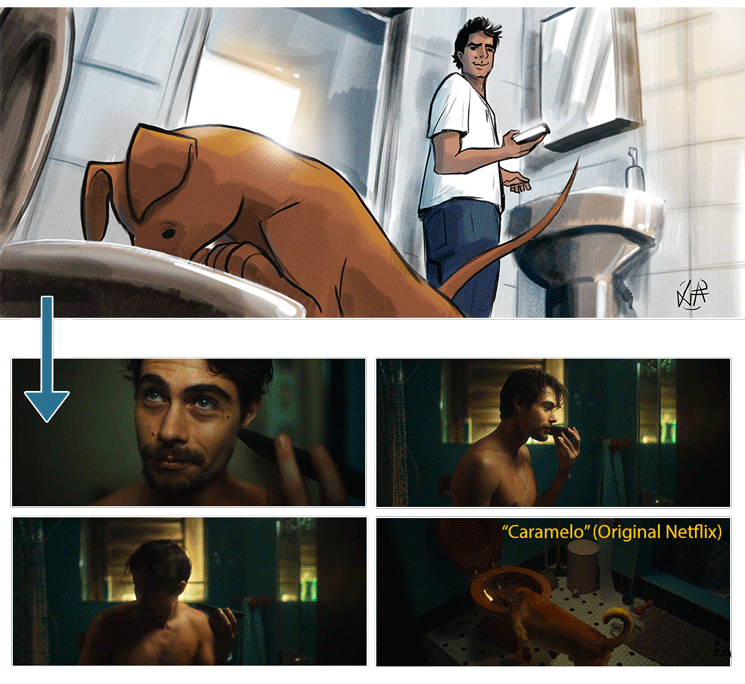 Mas em Caramelo, diferente do primeiro filme, Diego me chamou não só para desenhar, mas para participar da “soft-pré” – uma etapa antes da pré-produção, onde somente as diretorias participam, envolvendo dias de brainstorm baseado nas análises de cada cena.