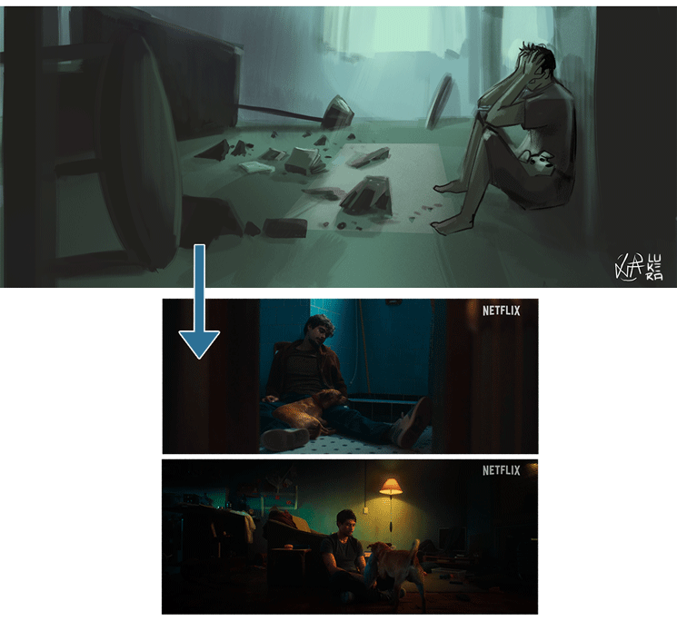 Além disso, produzi artes para algumas cenas que demandavam menos detalhes de câmera, para definição de clima e cores.